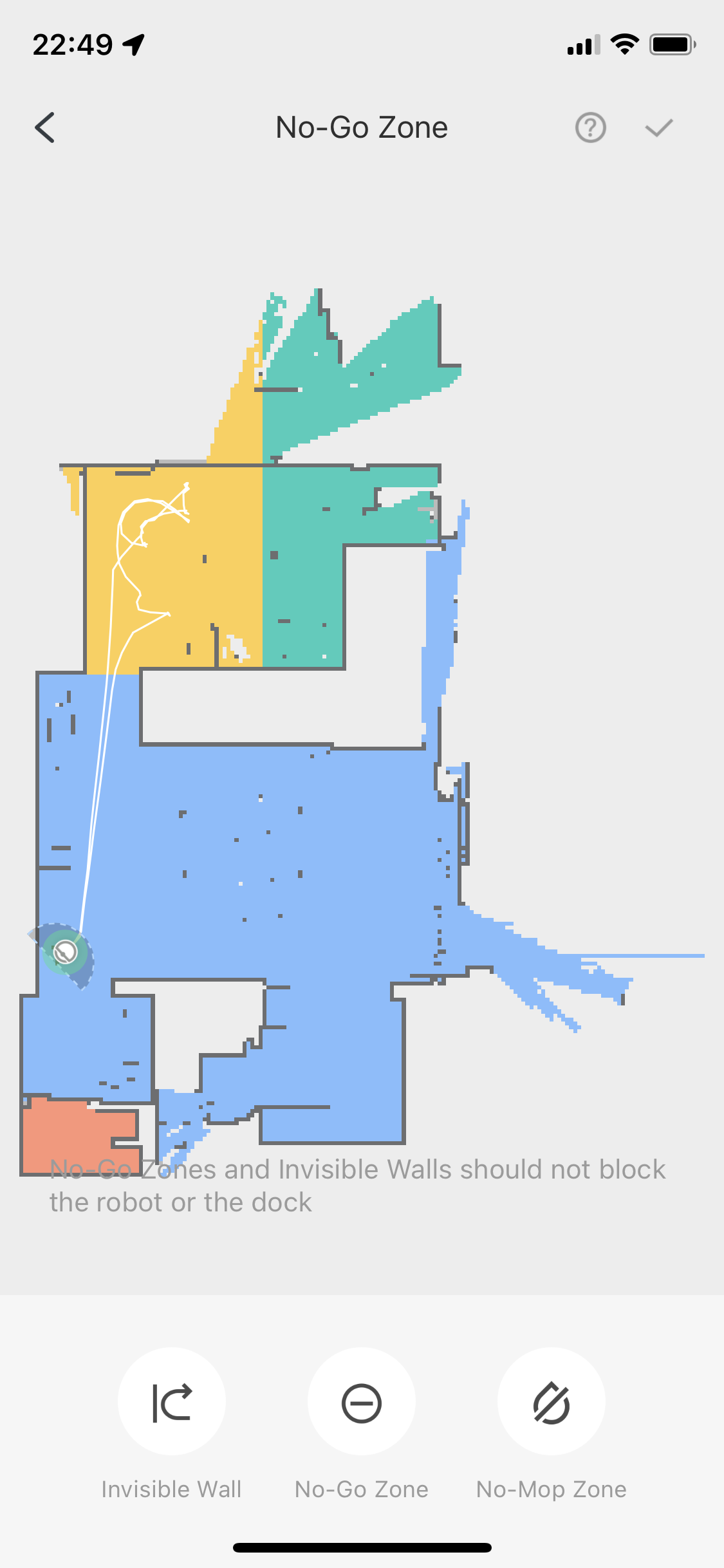 Ik zou zoals je zegt inderdaad eens de tapijt aan de kant leggen en hem die kamer laten stofzuigen zodat hij een volledige scan heeft. Daarna kan je dan correct een no-go-zone instellen.