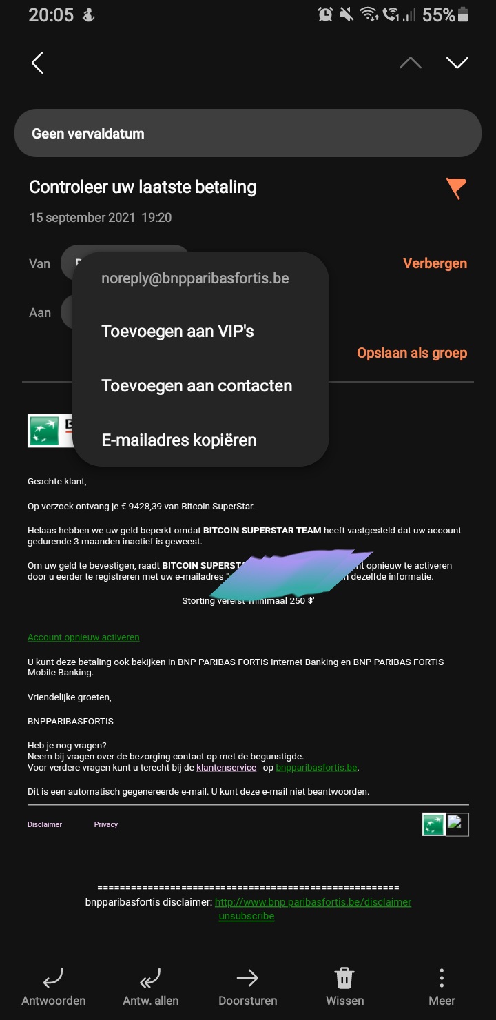 En alsof de opdrachtgever (Bitcoin Superstar in het screenshot) aan BNPPF zou laten weten dat je nog een account moet activeren voor ze "uw geld" op uw rekening zetten.