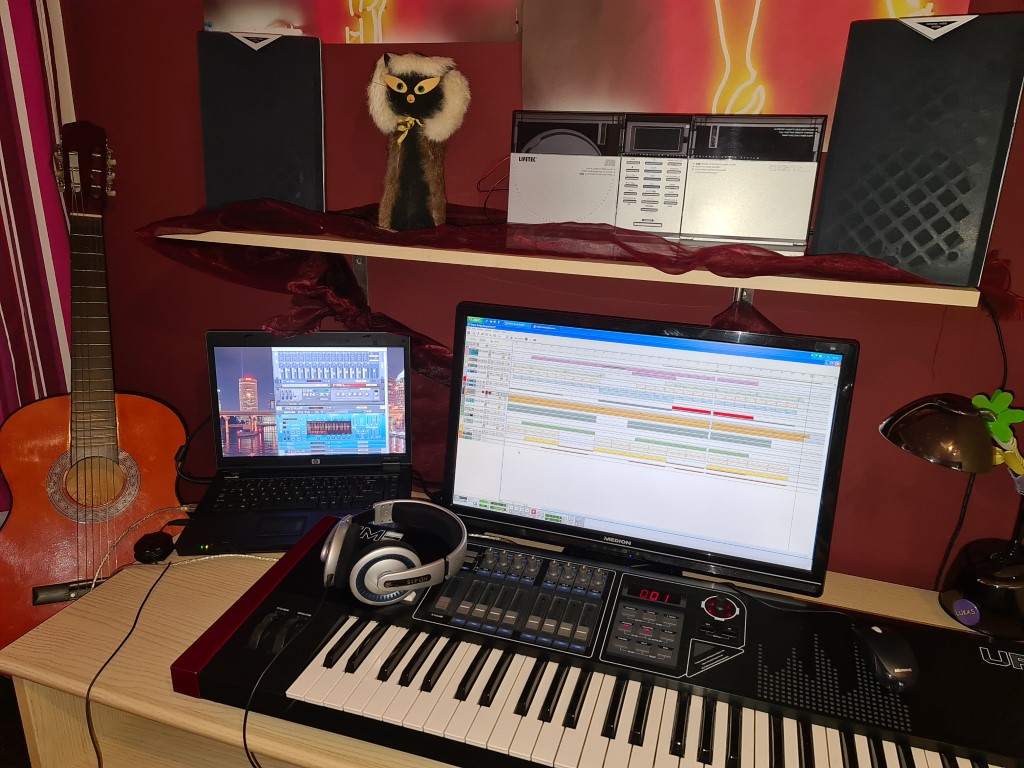 Lang voor het idee om met synths te 'klooien' heb ik deze geheel in Audacity in mekaar gezet 1j terug, op dezelfde speakers en bureau: