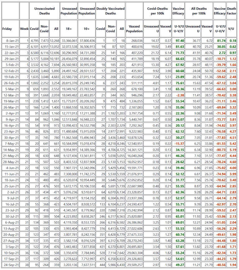 Bij het berekenen van de RRR moeten de groepen wel overeenkomen. In de UK zeuren ze door de tieners mee te tellen bij de niet-gevaccineerden, en dan krijg je hoofdzakelijk groene cijfers (positieve RRR) omdat er dan veel meer niet gevaccineerden zijn, en dus de ratio wordt gemanipuleerd. Als je de tieners er uit gooit, en dus de groep vergelijkt die zich wel mochten laten vaccineren, dan zijn vrijwel alle cijfers rood, en dan heb je effectief overwegend een negatieve RRR.