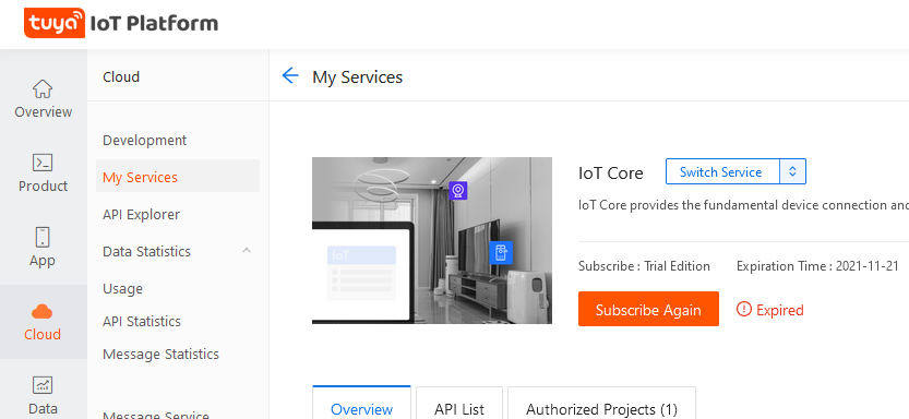 Na wat doorgelezen te hebben, blijkt dat de IOT core subscription slechts een maandg elid is (trial). Ik heb nu gevraagd aan tuya om die met 6 maand te verlengen, we zullen zien of dat werkt.