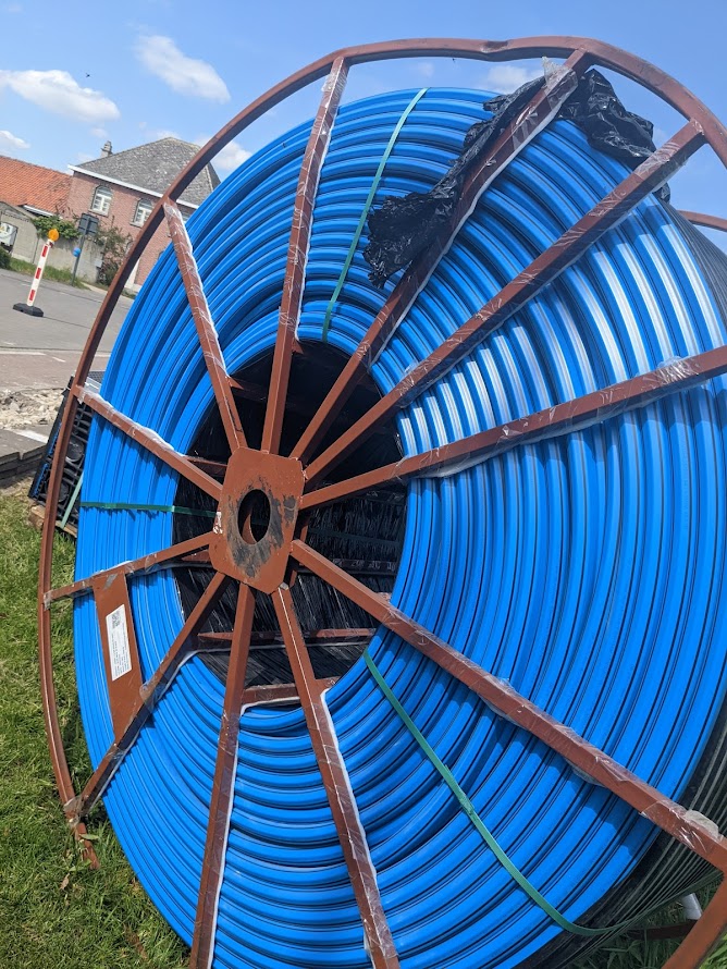 Hier in wetteren leggen ze naast de buizen van Fiberklaar (lichtblauw) ook meteen buizen van Telenet (zwart)