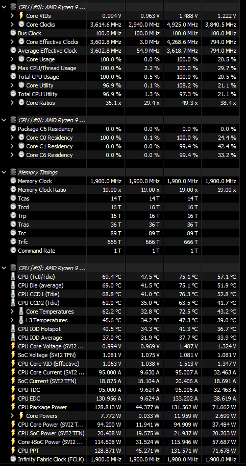 4. Bemerk dat bij loads van weinig tot één thread(s) altijd dezelfde cores worden gebruikt. Dit komt omdat AMD de cores individueel heeft getest en de cores die het hoogst boosten bij hoog voltage heeft gemarkeerd als dé cores om te gebruiken voor single of lowly threaded loads. HOE ZIE JE DIT? In hwinfo64 zie je bij het uitklappen van de CPU "Core Clocks" de tekst "(perf #1/1)" bij de best boostende core. Dan is er nog de tweede-beste core en die is gemarkeerd met "(perf #1/2)". De rest is gemarkeerd van 2/3 tot 7/8 bij mijn 5800X. Bij jouw 5900X gaan er maar zes cores in de beste CCD zitten, dus gaat het iets verschillen, maar het punt is hetzelfde.