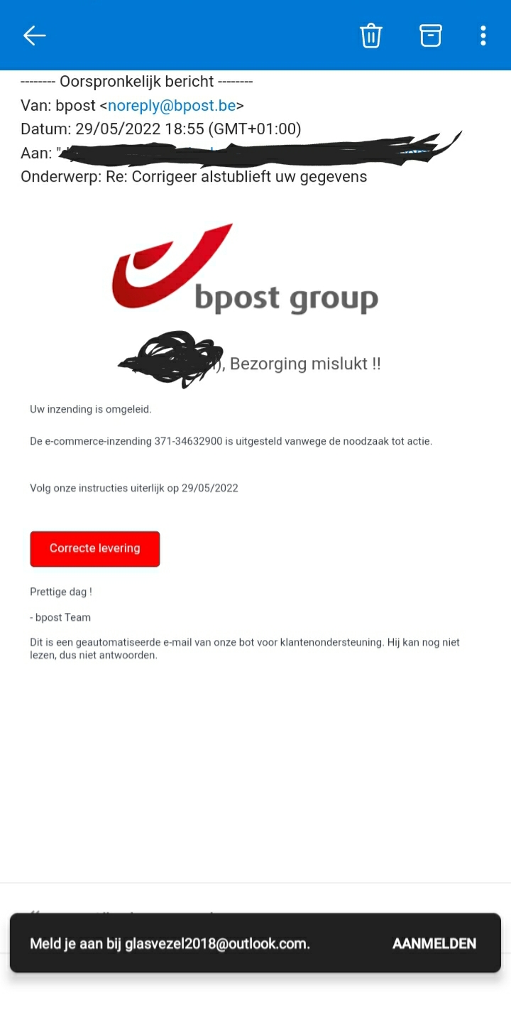 Gewoon via Outlook adres van Microsoft stuur ik de mail gewoon door.
