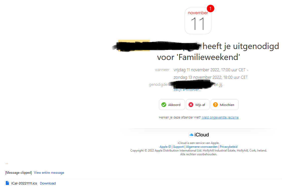 Zo zou het er normaal moeten uitzien. Ik kan de invite accepteren en zo komt het ook in mijn agenda. Maar als ik de email niet krijg is het soms vervelend want dan kan ik niets accepteren en zie ik het pas later bvb in de agenda zelf dat er iets instaat dat ik nog niet heb geaccepteeerd.