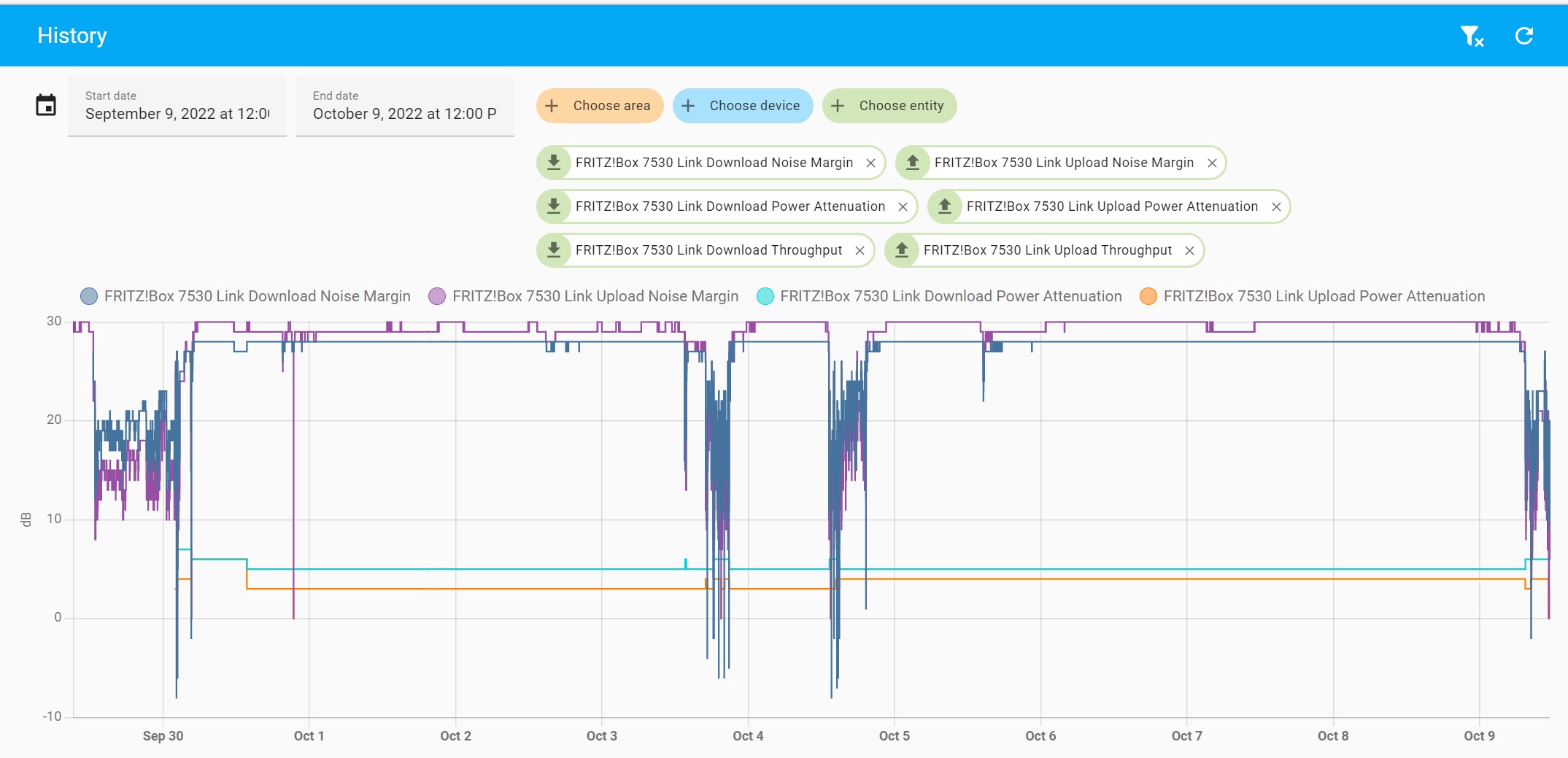Via HomeAssistant ben ik ook de lijnwaardes gaan monitoren. (waarom kan EDPnet dit niet?) Screenshots zijn van 1 maand.