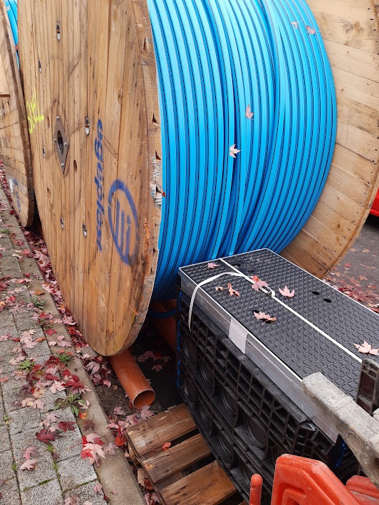 Een paar weken geleden hebben ze hier in het straat het voetpad opengebroken voor het plaatsen van een extra stroomkabel voor een paar huizen hier in het straat die een 3 fase 400v aansluiting willen. Terwijl hebben ze ook van Fiberklaar wachtbuizen gelegd.