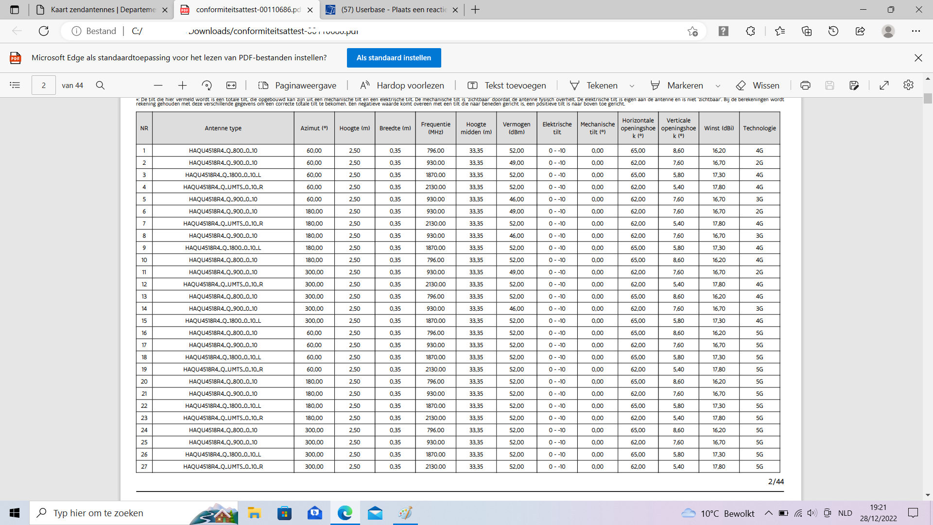 In bijlage info m.b.t. een Telenet/Base 2G/3G/4G/5G antenne