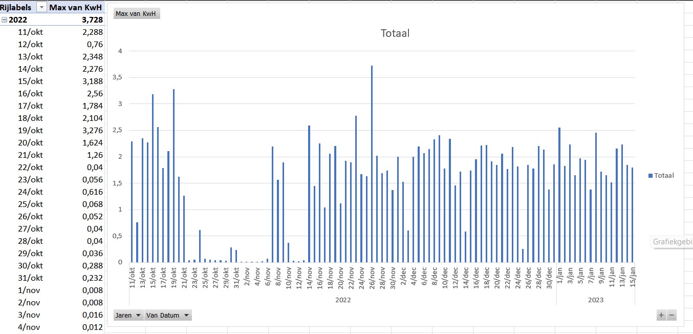 Max van KwH is de kolom die je maal 4 gedaan hebt veronderstel ik. Ik heb al jaren niet meer met draaitabellen gewerkt. Het overzicht per maand en dag krijg ik niet op de excelwereld :)