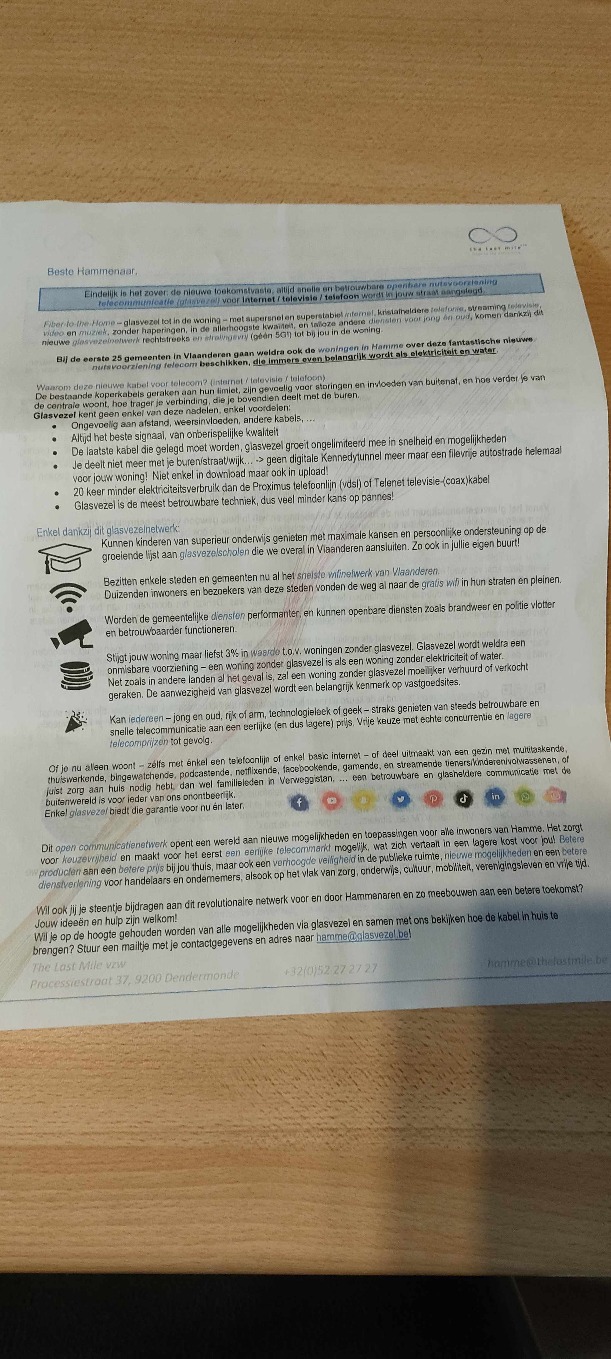 Er zat een brief in de bus waarin staat dat ze op de gevels in onze straat glasvezel gaan leggen. Er kan een binnenhuis aansluitkit besteld worden voor 50 €. Een all-in installatie kost 250 €. "Méér dan 60 providers zijn intussen toegankelijk via het open glasvezelnetwerk van The Last Mile!