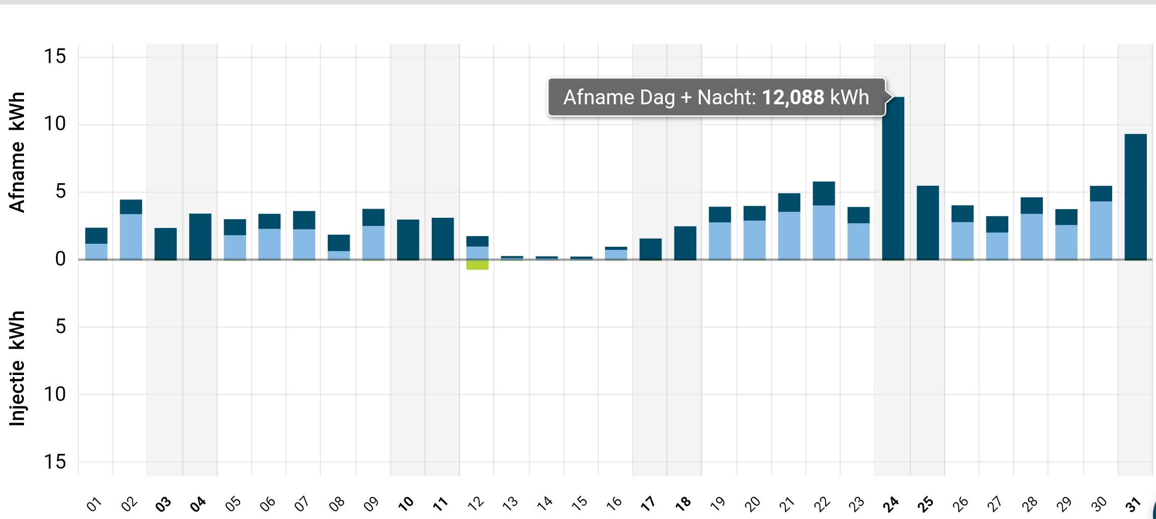 In het weekend zie ik enkel nachtafname, dat ligt aan mijn contract met energieleverancier waarschijnlijk.