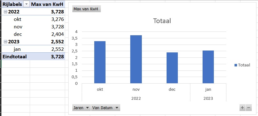 Max van KwH is de kolom die je maal 4 gedaan hebt veronderstel ik. Ik heb al jaren niet meer met draaitabellen gewerkt. Het overzicht per maand en dag krijg ik niet op de excelwereld :)