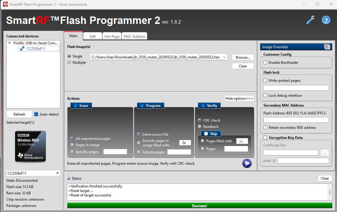 Even laten weten dat het met de smart RF Flash programmer 2, dat is dus software van Texas Instruments, en een FTDI adapter -voorzien van de juiste driver- goed gelukt is.