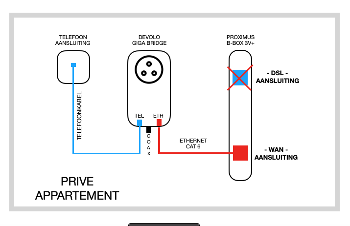 En ja, daar is een elegantere oplossing via een #DEVOLO GIGA BRIDGE” adapterkit. Met deze adapters kun je het ethernetsignaal dat uit de fibermodem komt, met de DEVOLO via een bestaande COAX / TEL lijn naar de juiste plaats brengen waar de BBOX3 staat. Zie hieronder het schema.