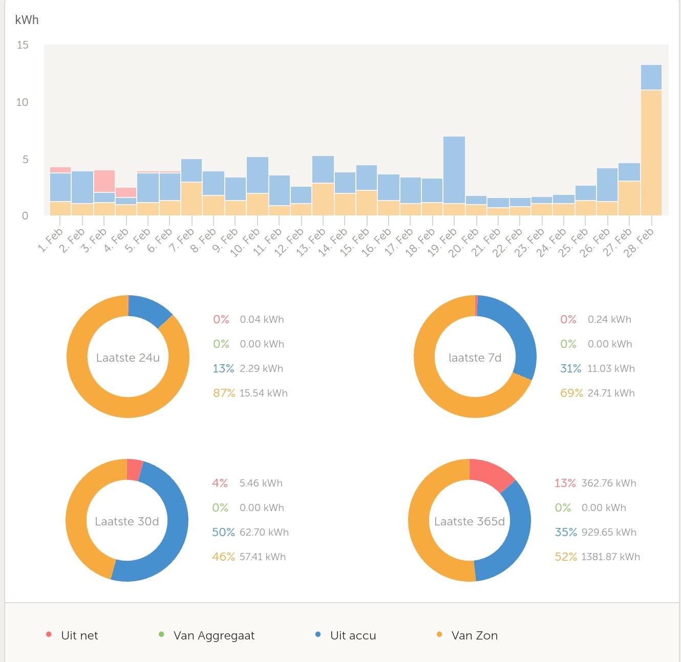 - Gezien mijn normaal verbruik tijdens de dag rond de 750W is (met één piekje van 3.85kW tijdens het koken), lever ik dus terug, zelfs op een dag zonder zon?