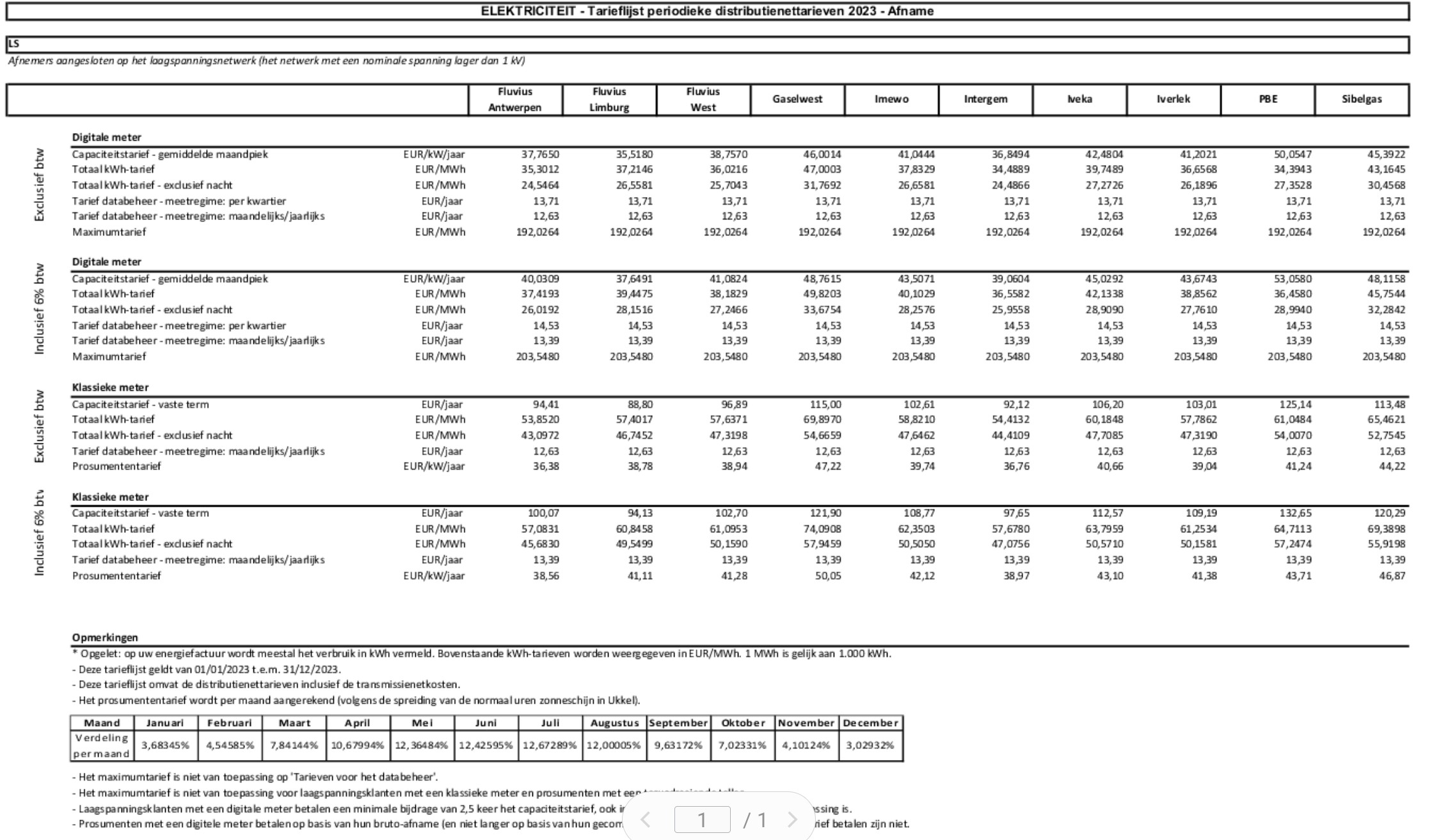 De max. factuur voor nettarief (op kW + kWh) is voor alle subnetgebieden gelijk, nl. 20,3548 c€/kWh (incl. 6% BTW).