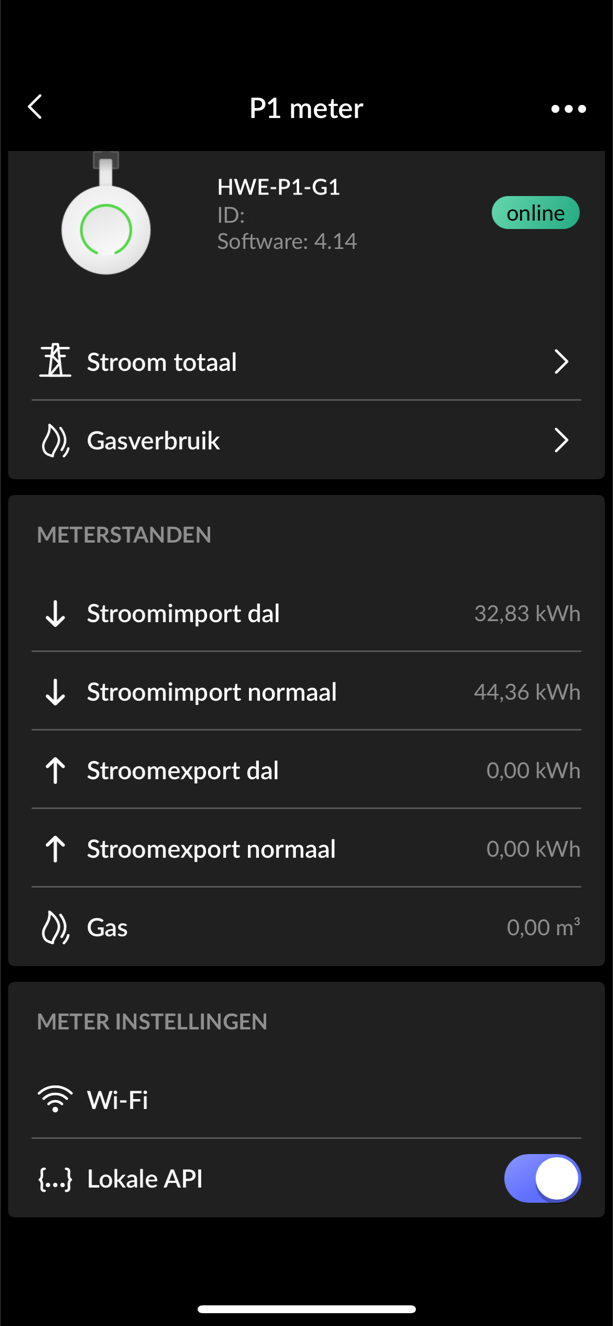Extra info en API documentatie Standaard staat ook de API aan waardoor je bv kan koppelen met Home Assitant, Openhab... Zie de API documentatie via volgende link: https://homewizard-energy-api.readthedo ... oints.html