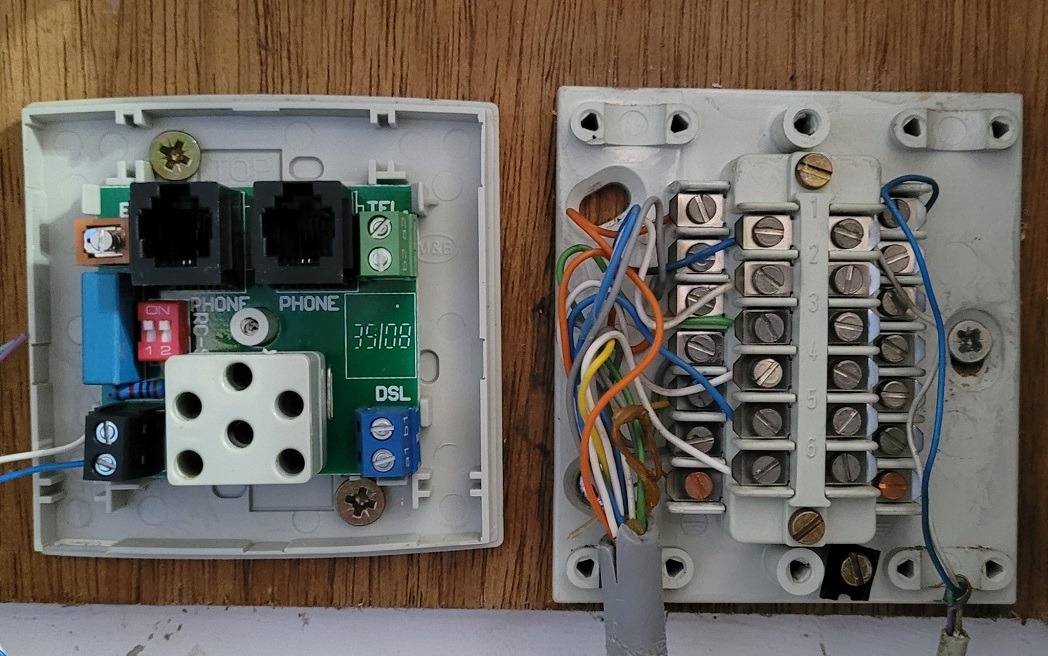 Na wat werken in de garage, vlak waar de telefoonlijn binnenkomt, is mijn internet verbinding weggevallen (EDPNet vdsl2). Als ik de bedrading bekeek zag ik maar 1 aangesloten draad (witte draad in de a). Ik heb geen kennis van hoe intern dit juist in zijn werk gaat, maar ik vermoede dat de blauwe in de b moest...?