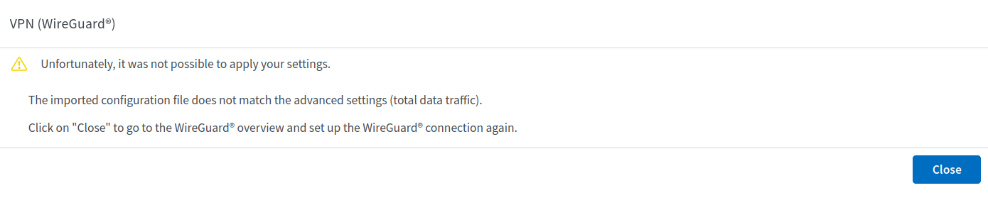 Click on "Close" to go to the WireGuard overview and set up the WireGuard connection again."
