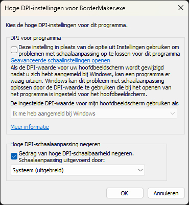 Opgelost: Bordermaker is aan java applicatie en ik heb de compatibiliteitsmodus veranderd van java.exe door het te zetten naar Windows 8 compatibiliteit en ook de hoge dpi instellingen te veranderen naar systeem, waardoor de dpi scaling wordt aangepast naar de resolutie van het scherm (gedrag van hoge dpi-schaalbaarheid negeren. Schaalaanpassing uitgevoerd door: systeem).