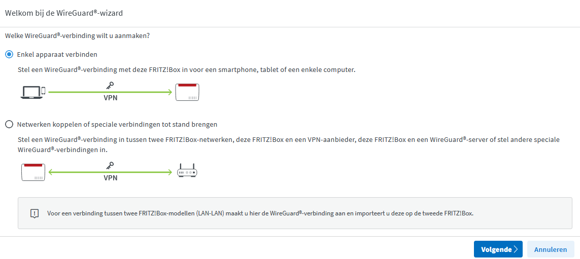 • je kan de Fritz!Box via WireGuard verbinden met een externe VPN server (vb de gratis protonvpn.com).