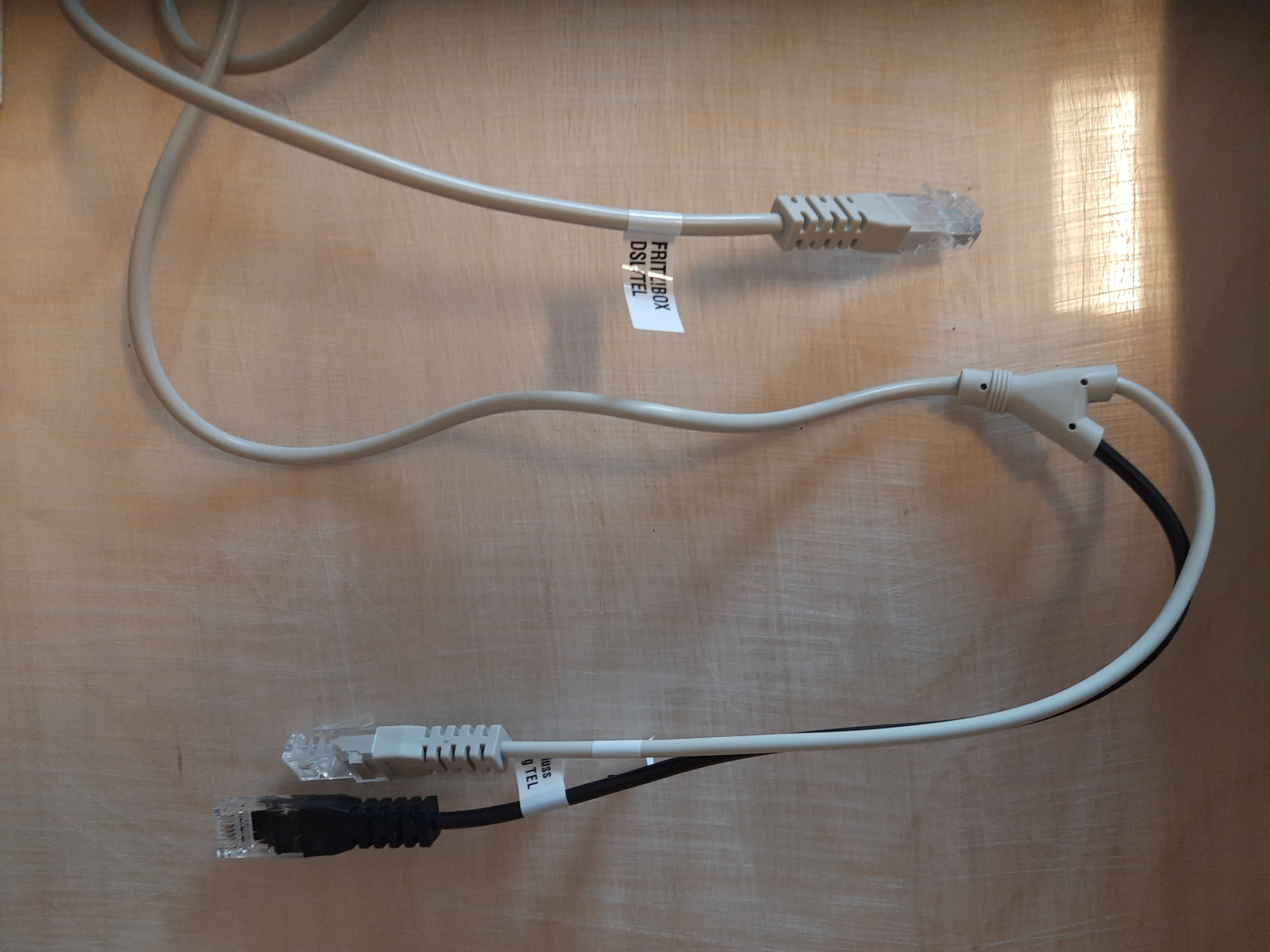 • de bovenste kabel (Y-kabel) moet je gebruiken als je ook nog een vaste lijn hebt (ISDN of analoog). Het witte einde gaat (RJ45) op je DSL uitgang (na de splitter), het zwarte uiteinde (RJ45) op de telefoon uitgang: ISDN zonder adapter, analoog met adapter (gebruikt in Duitsland).
