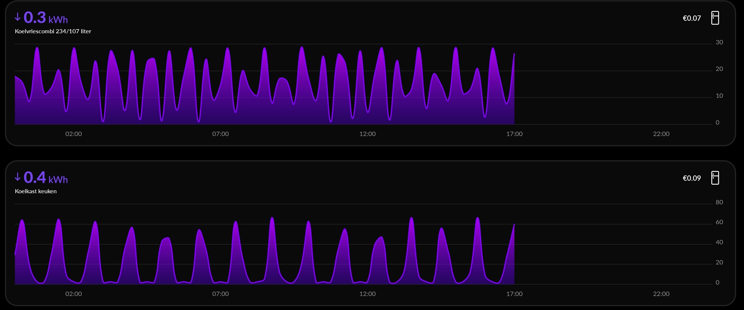Via HA en een fibaro meter ben ik het verbruik van mijn koelkast/diepvries combi aan het uitlezen. Het verbruik gaat van 0,9 watt naar 74.1 watt op het hoogste.