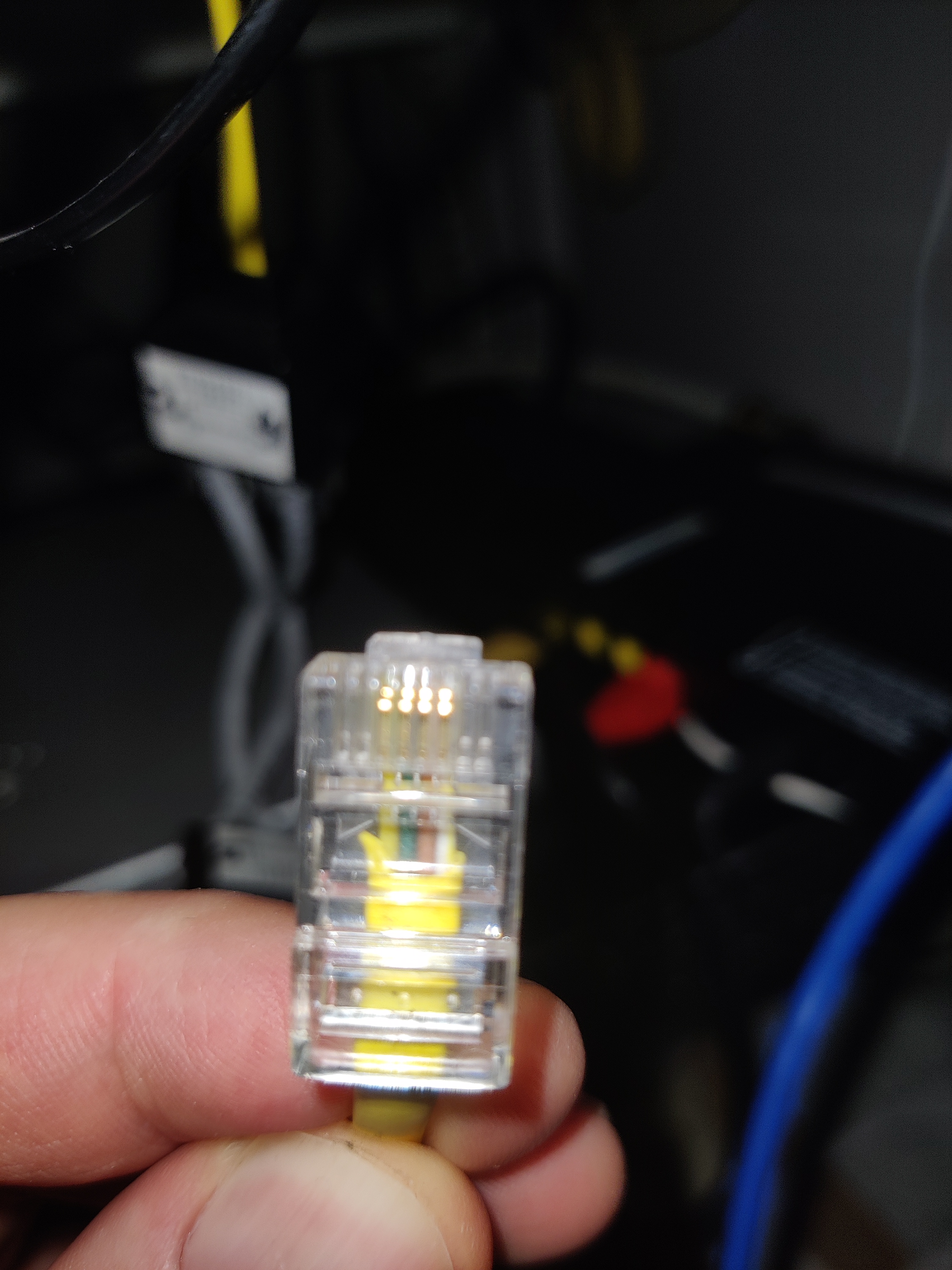 Ik ben in een kantoor aan het helpen in de conversie van een analoge PBX naar een FreePBX-centrale. Voor de telefoons is de conversie eenvoudig maar mijn vraag is afkomstig van twee analoge deurbellen die verbonden zijn met de PBX. Vanuit de twee deurbellen komt een gewone netwerkkabel met vier koperparen aan bij de PBX waarvan twee paren per deurbel aangesloten worden op de PBX door eerst tweemaal twee draadjes op een RJ45-connector te connecteren, waarna aansluiten op een adapter (ik gebruik wellicht de verkeerde benaming maar dus geen idee hoe dat heet) zoals op onderstaande foto. Hierna worden 4 koperdraadjes opnieuw op een RJ45-connector geconnecteerd zoals op onderstaande foto met inpluggen op de analoge PBX. De nieuwe situatie gaat worden: deurbel --> ATA --> FreePBX-centrale