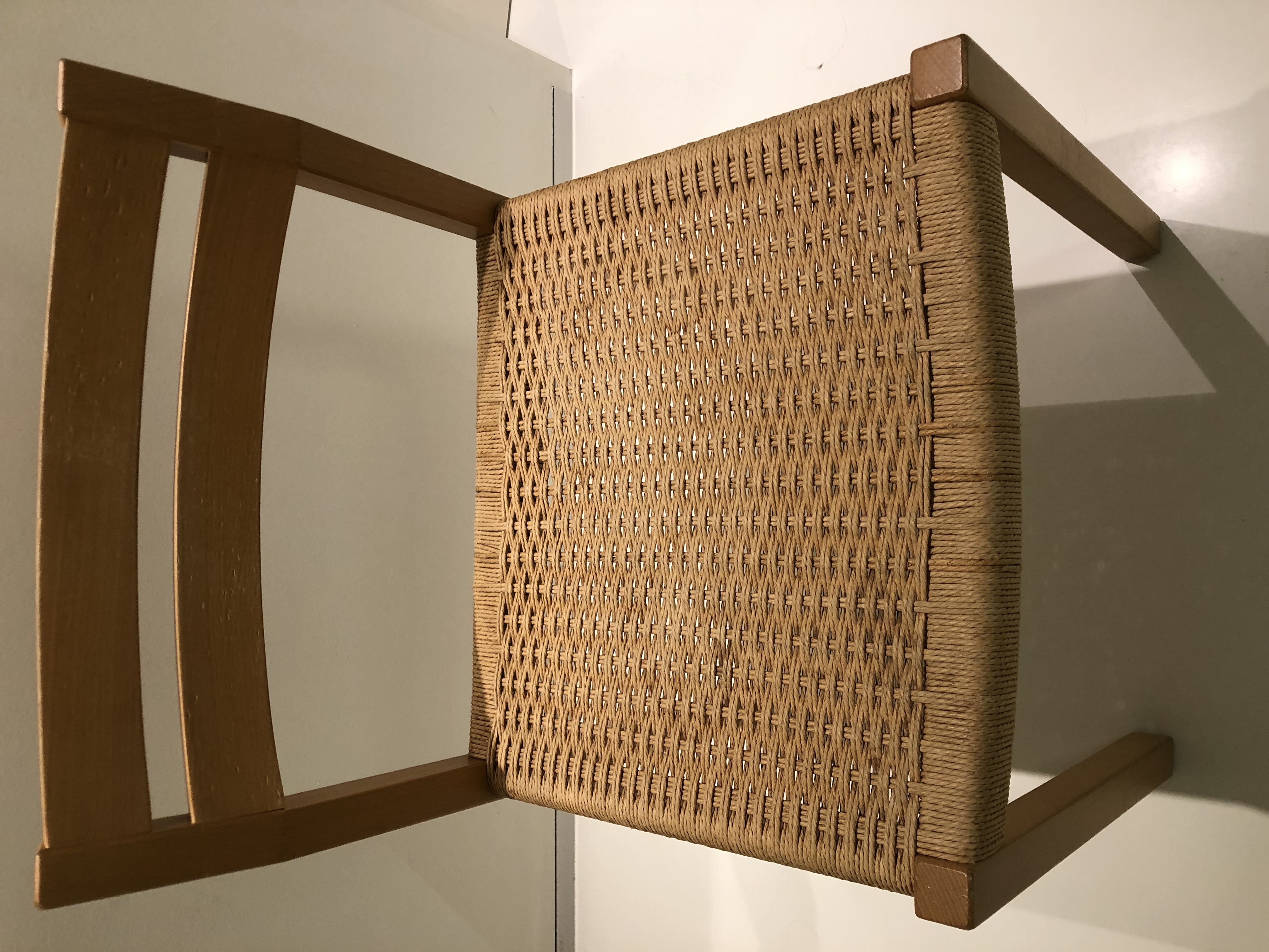 Ik heb een aantal vintage stoelen van de Deense designer Niels Moeller met een zitting in gevlochten paper cord waarvan een aantal koorden doorgesleten zijn.