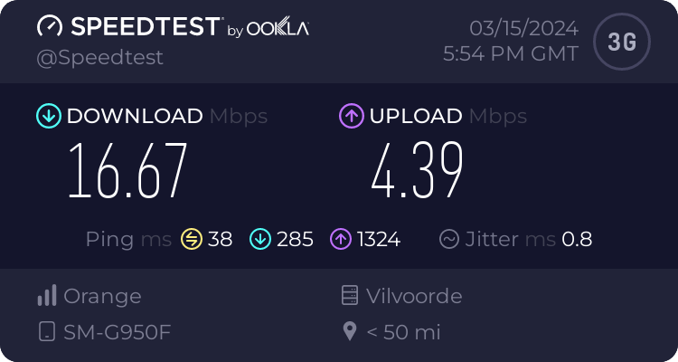 3G is eigenlijk ook niet zo slecht, beetje zoals een wat tragere VDSL2 lijn: https://www.speedtest.net/result/a/9980205354