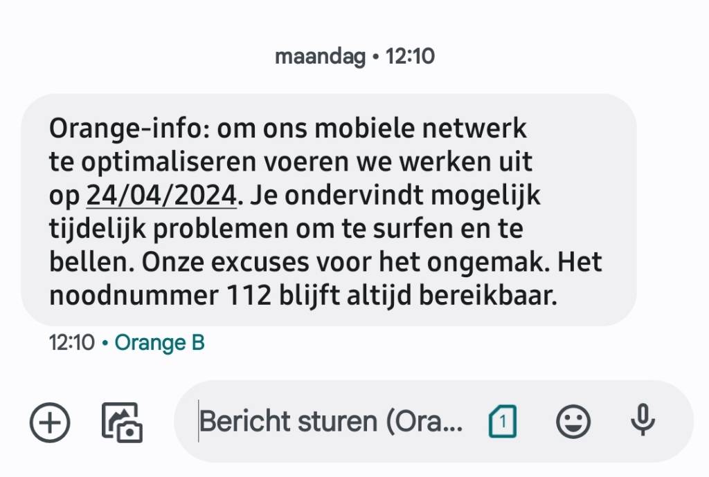Maandag ook deze sms gehad maar als ik op orange ging kijken stonden er geen werken gepland in Hasselt voor deze periode maar wel Leuven en Brussel en Antwerpen. Hebben ze mss deze sms gestuurd omdat ik voor het werk veel in deze regio's ben. Of was het intern bij hun mss.