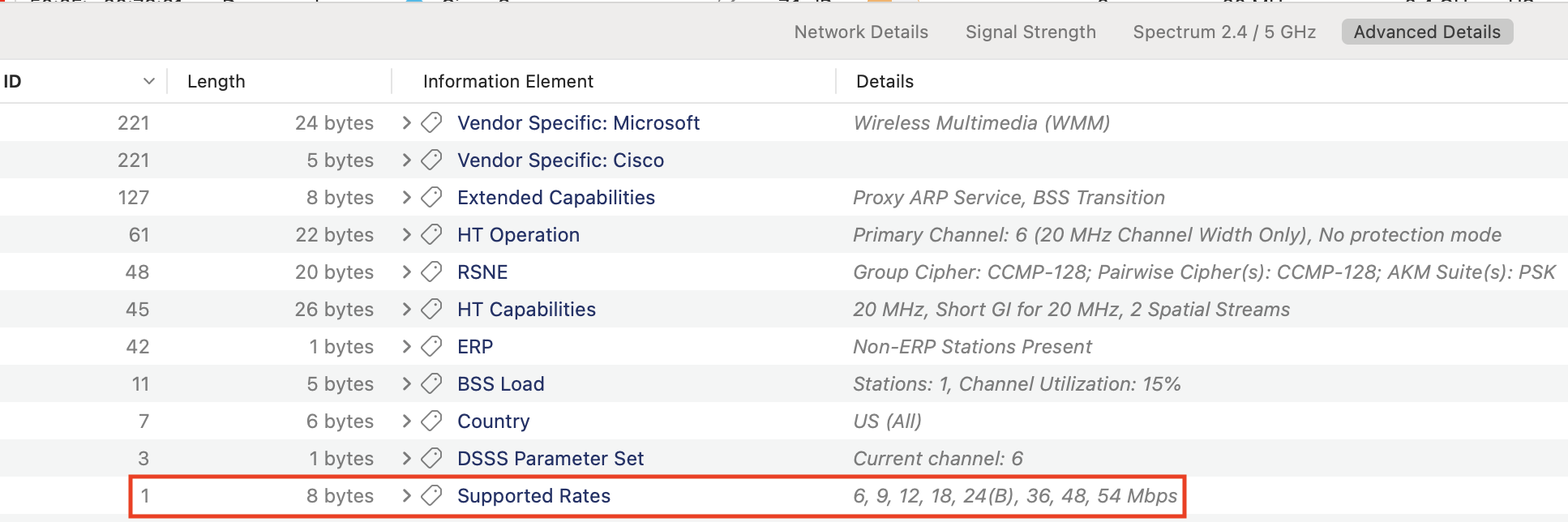 Kan je in de "geavanceerde" details van inSSIDer zien wat de data rates zijn? Zit in de SSID gecodeerd dus normaal wel zichtbaar.