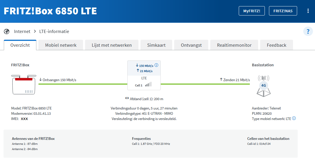 Mobiel netwerk ↓ 150,0 Mbit/s ↑ 21,0 Mbit/s (volgens de "LTE informatie" op de Fritz!Box)