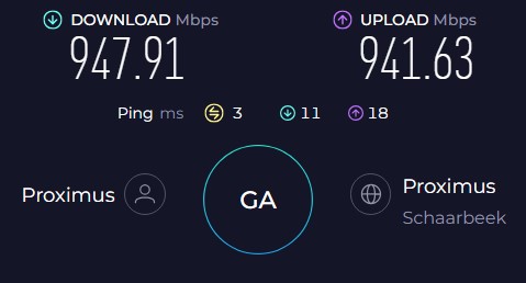 Mijn PC is met een kabel aangesloten en heeft een netwerkkaart van 1Gbit dus ik weet ook wel dat ik nooit die 2.5Gbit zal halen hiermee, maar ik had toch minstens 500Mbit verwacht. Trouwens via 5gHz wifi met mijn smartphone krijg ik hetzelfde resultaat en als ik met zowel mijn PC als mijn smartphone tegelijkertijd een speedtest uitvoer dan zie ik ook dat die 100 Mbit verdeeld wordt over de 2 toestellen.