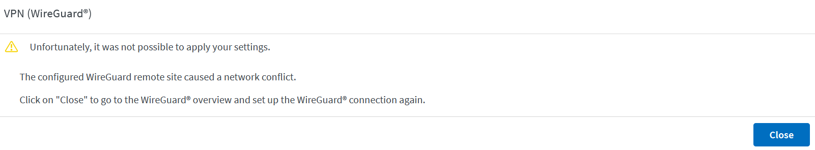 Click on "Close" to go to the WireGuard overview and set up the WireGuard connection again."