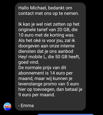 Ik snap je punt. T is een risico. En 40gb voor 10€ is al mooi. Ben zelf aan het twijfelen om van 40gb naar 50gb te gaan. Je snapt toch dat mensen die Hey klanten zijn (en dus prijsgevoelig zijn) graag minder betalen voor meer data? Welke garantie’s verwacht jij van Hey? Dat ze in dikke vette letters op hun website gaan schrijven "Aan alle mensen die indertijd op ons mooi abo van 20GB voor 15€ een serieuze korting hadden van 5€ (33%) én die vervolgens snel hun boost naar 40GB kregen: het kan NOG beter: voor 1€ minder krijg je 10GB extra". Gaan ze uiteraard niet doen. Email sturen ook niet, denk ik.
