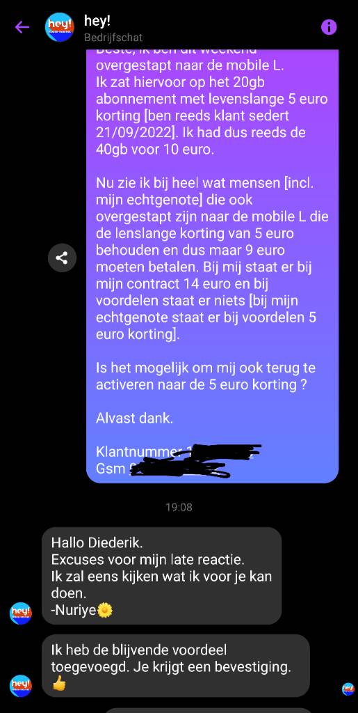 Ik heb net eens in chat van hey! nagevraagd ivm de €5 korting met nieuwe Mobile L formule.