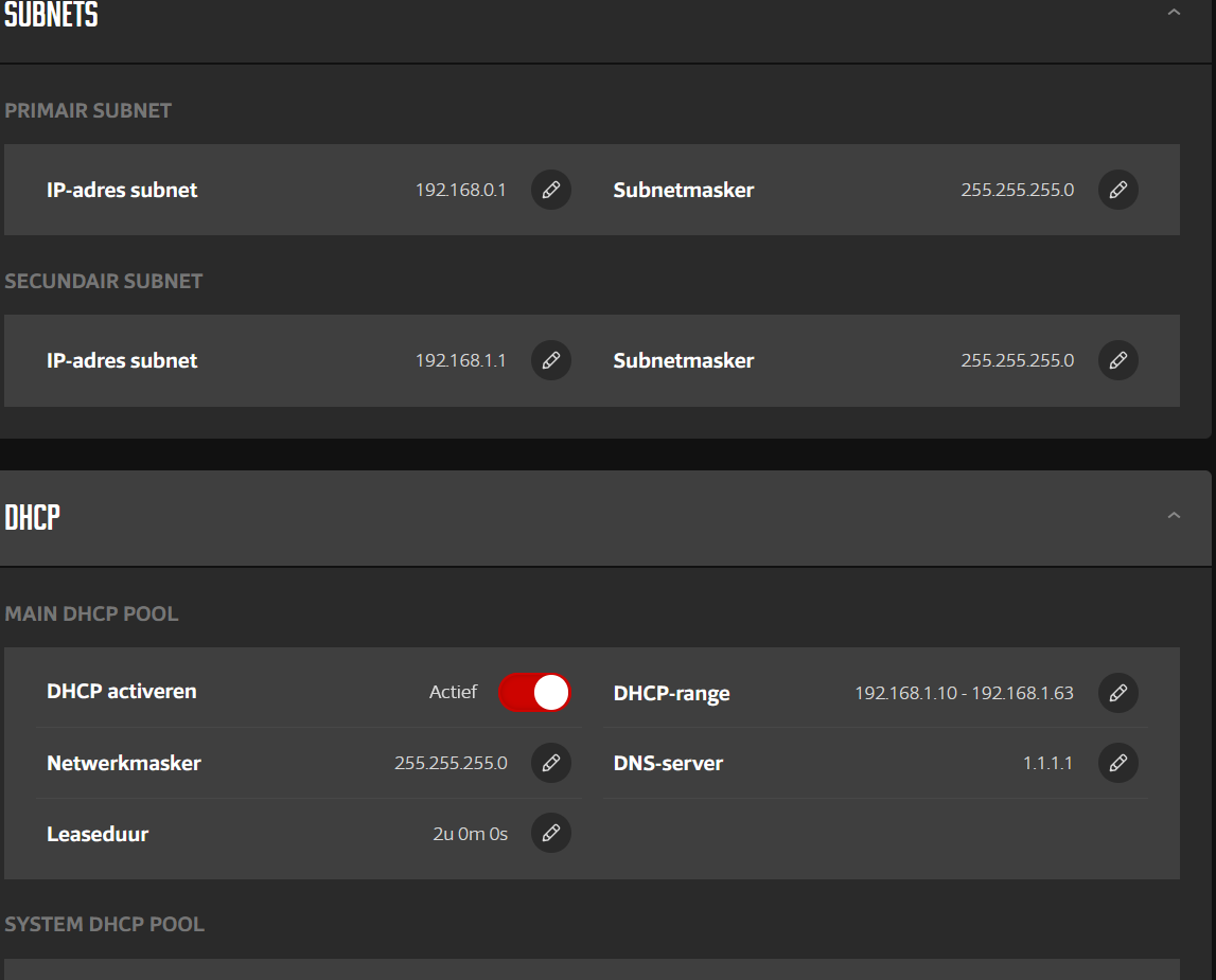 - IP adres = 192.168.1.1 subnetmasker 255.255.255.0 [dit subnet heeft geen DHCP pool]