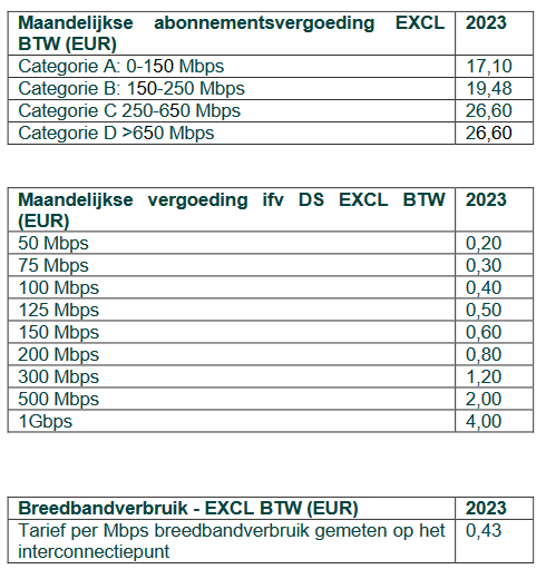 Ik denk dat je deze tabel moet nemen. Totaalprijs is dus som van alle 3 de tabellen. Daarnaast is er ook nog een interconnectievergoeding (volgens bandbreedte die moet betaald worden voor alle klanten samen). Die B2B-prijzen van die andere tabel is blijkbaar wanneer de operator die diensten aanbiedt aan een bedrijf waarop dan QOS kan geactiveerd worden.