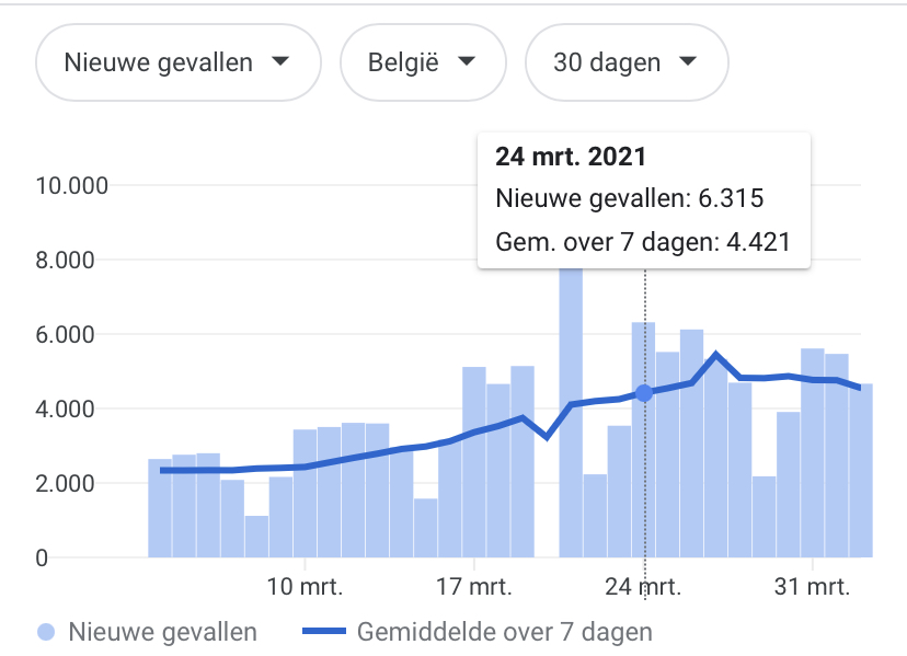 Exact hetzelfde als wat we in de tweede golf zagen dus, alhoewel het nu geen structureel nieuwe teststrategie is (of toch niet dat ik weet), maar een (grote) dagelijkse variatie in testen, waardoor we nu ook nog geen forse daling zien zoals toen. Ook de positiviteitsratio toont niet aan dat er een piek was op 24 maart, want op 29 maart steeg ze nog met 0.10%. Het lijkt waarschijnlijk dat de werkelijke piek - los van het aantal testen dus - op 30 maart gevallen is, maar we moeten nog wachten voor meer zekerheid daarop. Iig zou de "31 maart" in je google grafiekje nog hoger gelegen hebben dan "24 maart," mits er op 30 maart minstens evenveel getest zou zijn als 23 maart (quod non).
