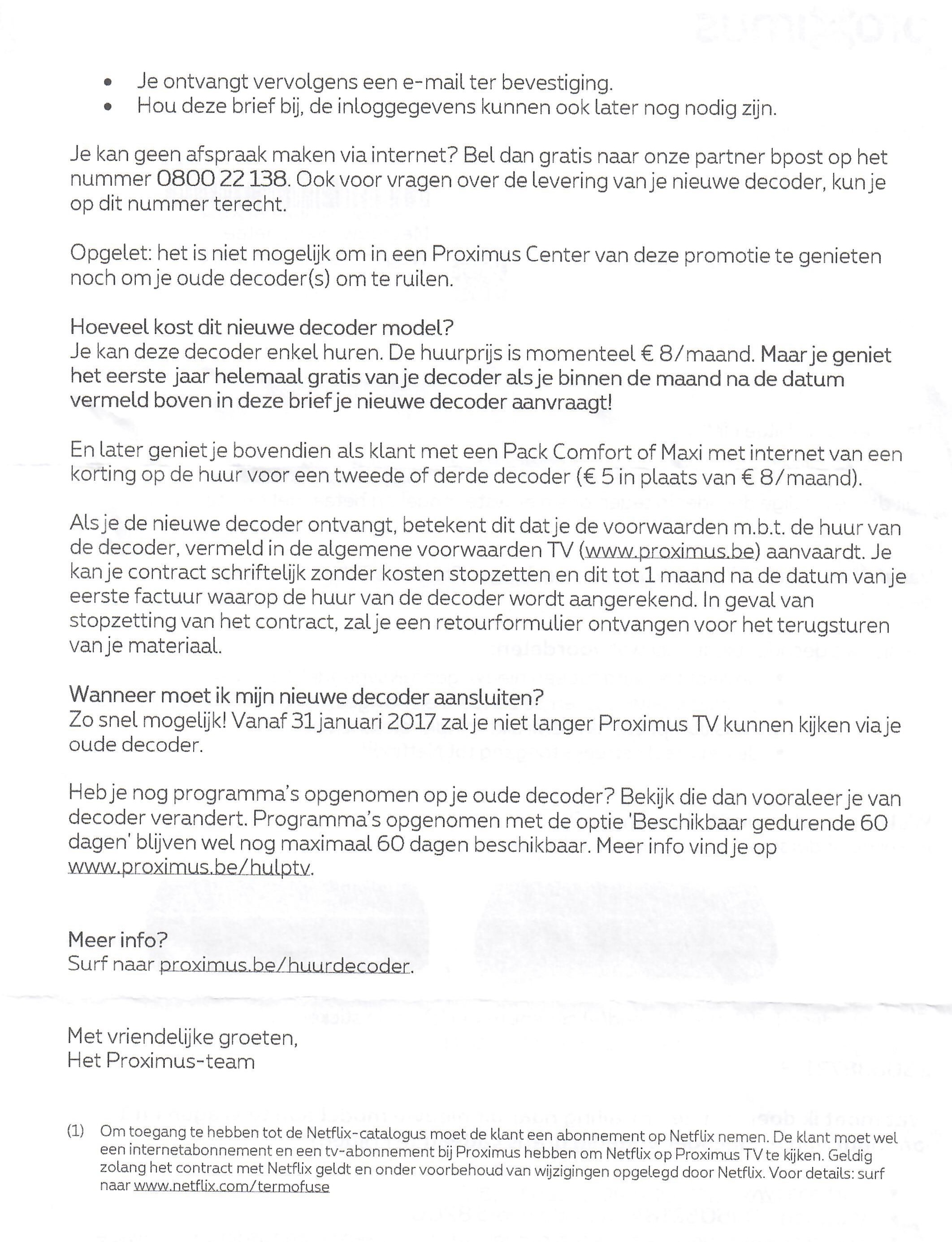 vanaf 31 januari 2017 zal je niet langer Proximus TV kunnen kijken via je oude decoder.