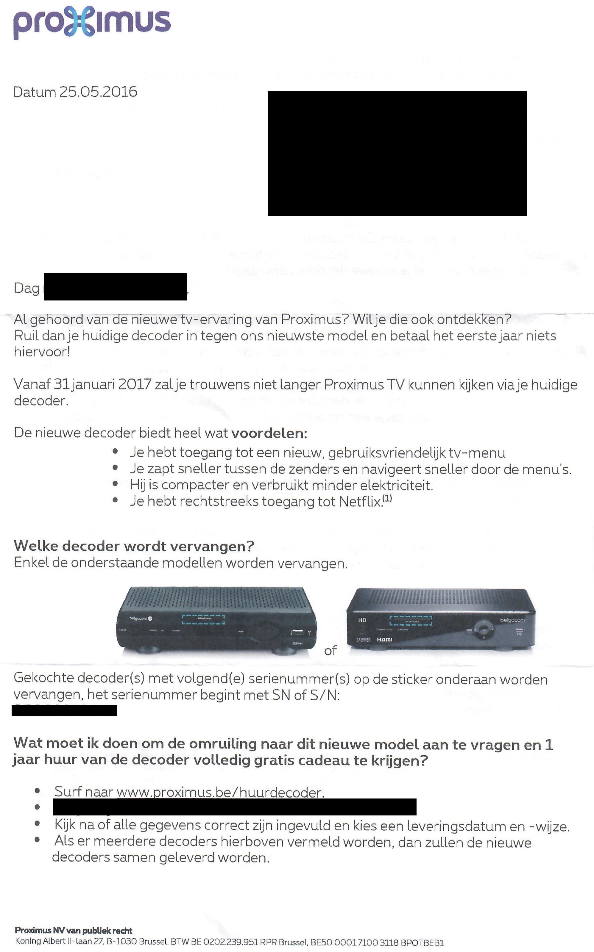 jackho schreef:Proximus is inderdaad nog maar onlangs gestart met versturen van brieven voor aangekochte V3 decoders,