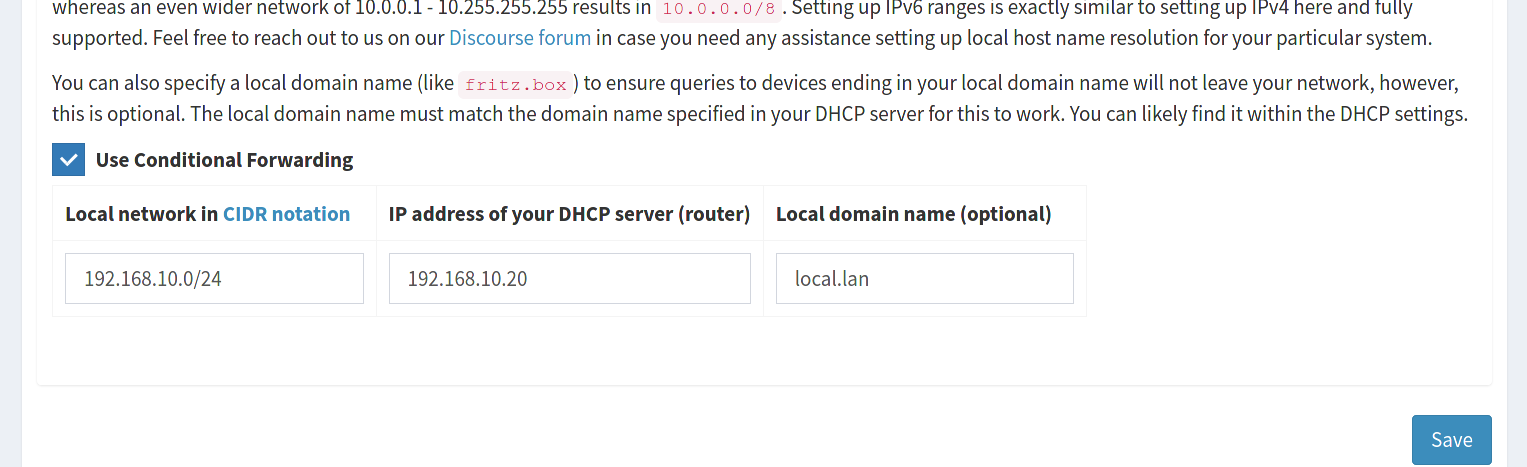 Dat hele "conditional forwarding" is iets wat IMO beter gedaan is in AdGuardHome, gezien je daar iets fijnere controle hebt.