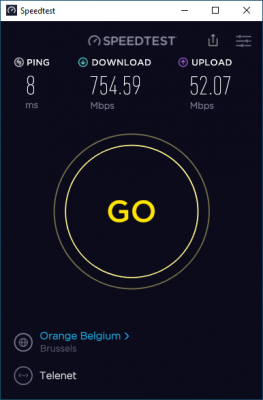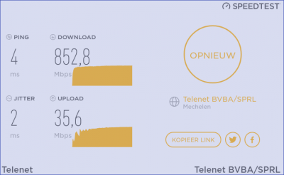 Getest op m'n game-PC via remote desktop en de Speedtest uit de Microsoft Store naar de Telenet servers in Mechelen.