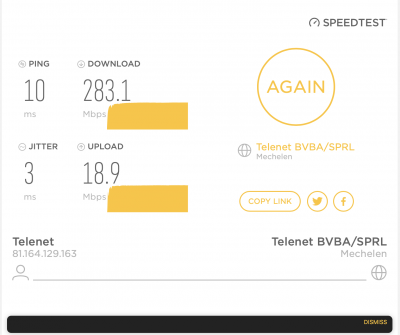 Thuis in Bunsbeek (Vlaams-Brabant, net boven Tienen) ook geüpgrade van een Whoppa met FiberInternet200 naar een Wigo, na een herstart van de modem (en ik behou nog hetzelfde IP adres ook) haal ik nu ook 'ongeveer' de 300/20 met de CV7160E modem-only setup.