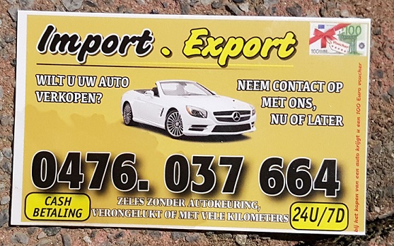 Intussen een kaartje met nummer in handen gekregen: "Car Export"; 0470 51 22 20