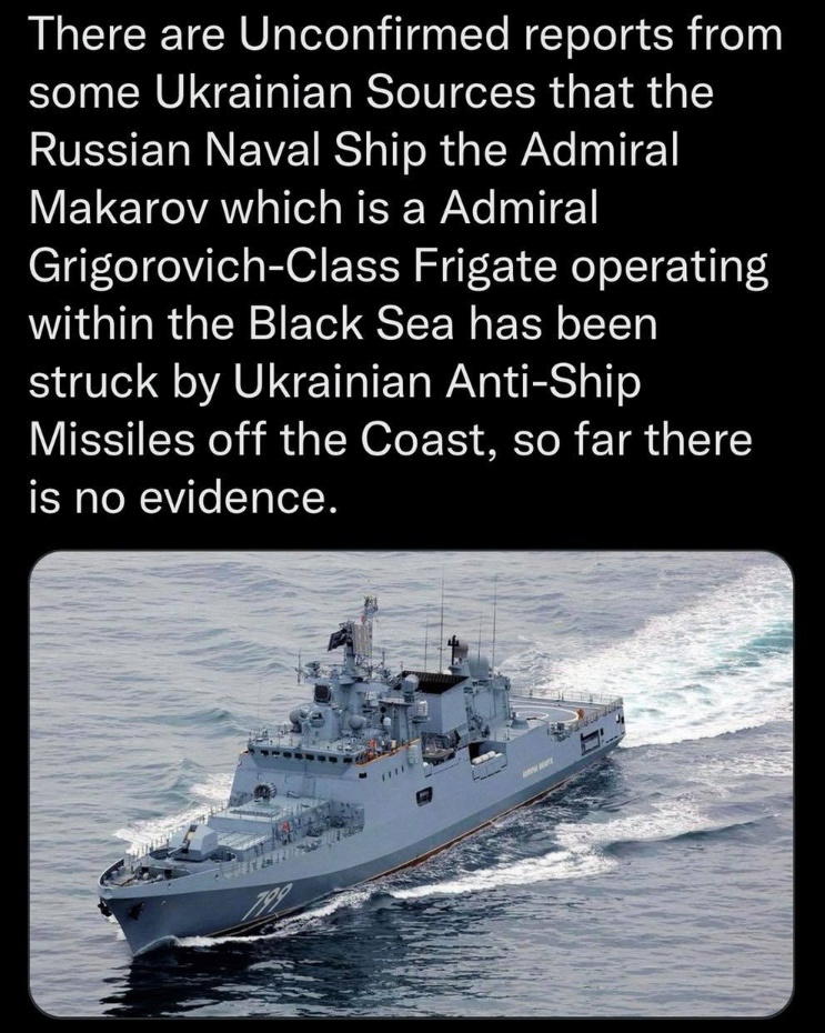 The Admiral Makarov is said to have been struck by anti-ship missiles while it was in waters off the coast of Odessa. Rescue ships and aircraft have reportedly been sent to the area and are being tracked by US surveillance drones. "OSINTdefender" :lol: , an open source intelligence monitor, tweeted: "It’s seeming more and more likely that the claims about the Russian Frigate Admiral Makarov being stuck by Ukrainian Anti-Ship Missiles off the Coast of Odessa are true.