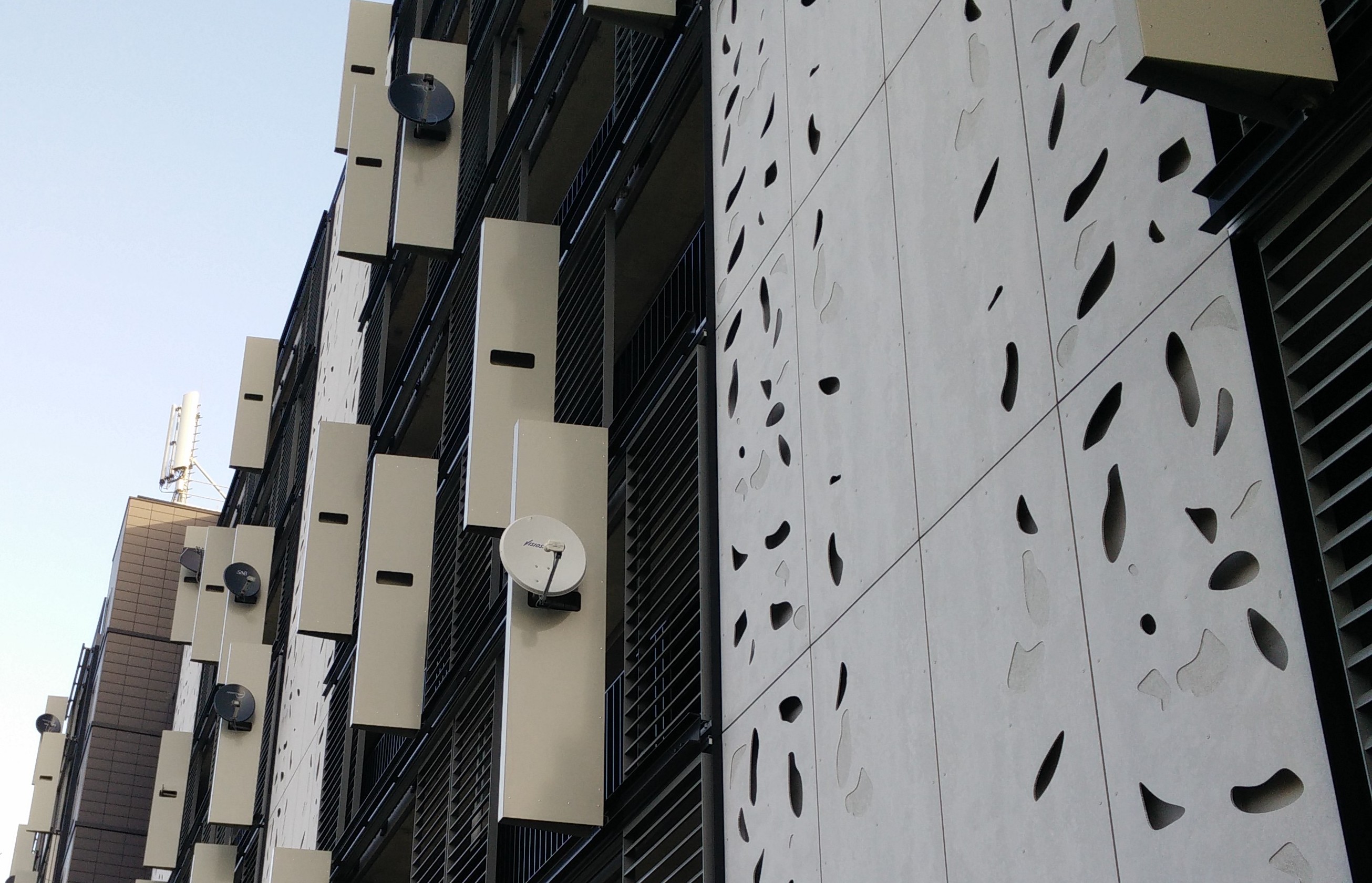 Misschien niet 100% duidelijk te zien: maar bij iedere terras is zo'n plaat bevestigd (dat ook dient als zonnewering), waar de bewoner een schotel kan bevestigen, met een opening om de kabels erdoor te trekken.