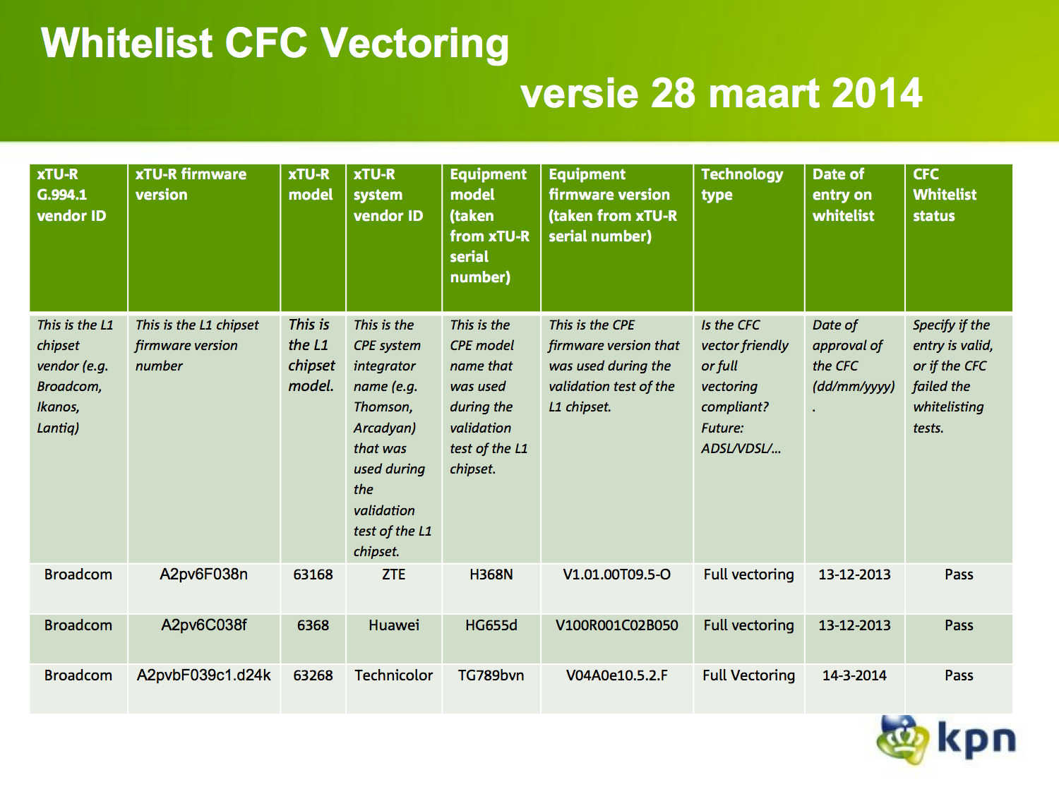 Een van de meest gebruikelijke (specifiek vectoring) HW problemen heeft te maken met correcte implementatie van de DLE, zodat een modem zijn bundel niet stoort indien de netstekker plots wordt uitgetrokken. Daarvoor dienen grote condensatoren voorzien te zijn op de modem, en indien die te klein zijn: jammer maar helaas, geen whitelist.