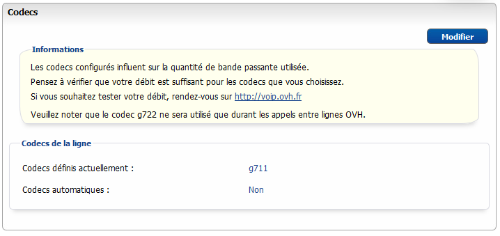 • Specifiek voor OVH. Bij OVH kan je ook via hun website de keuze van een codec beïnvloeden waarmee jouw gesprekken plaats zullen vinden. Ook jij kan dit instellen indien je dit wil. Doch dit is niet noodzakelijk indien je de aanpassingen hebt doorgevoerd zoals ik in vorig puntje heb beschreven. Bij sommige toestellen is het niet zo eenvoudig als met een Siemens Gigaset basisstation om de codec te selecteren. En dan is deze mogelijkheid die OVH biedt uiteraard meer dan welkom.